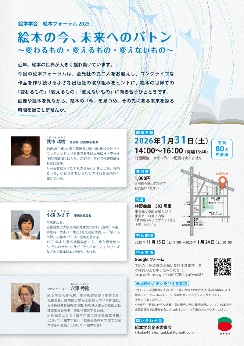 近年、絵本の世界が大きく揺れ動いています。絵本をめぐる情報や出会いのかたちが多様化するなか、出版社におけるマーケティングや宣伝、販売の方法、編集者の役割も変容しています。今回の絵本フォーラムは、至光社のお二人をお迎えし、ロングライフな作品を作り続ける小さな出版社の取り組みをヒントに、絵本の世界での「変わるもの」「変えるもの」「変えないもの」に向き合うひとときです。